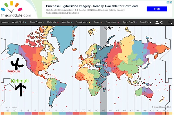 A1- We know that many people like us don’t know where it is? but have found it for us ad you. It is a city called: “Kirtimati”. It is a very tiny island in the south ocean and practically is the first place on earth to start a new year. You can read about this island by “Clicking Here“. The amazing point is that when in the “Honolulu” of US the time was Monday 31 Dec midninght, it was the Jan. 1st at “Kirtimati even they are in the same geographical zones (look at the left image);